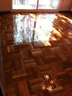 Colocamos 3 fotos de tarima maciza de jatoba para ver la terminación con el acuchillado y banizado de un baño y una cocina.