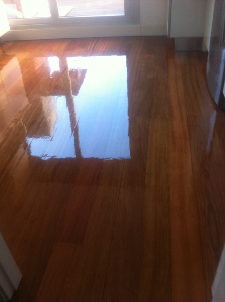 Tarima de madera maciza de Jatoba colocada a la española y acuchillada y barnizada en acabado brillante.