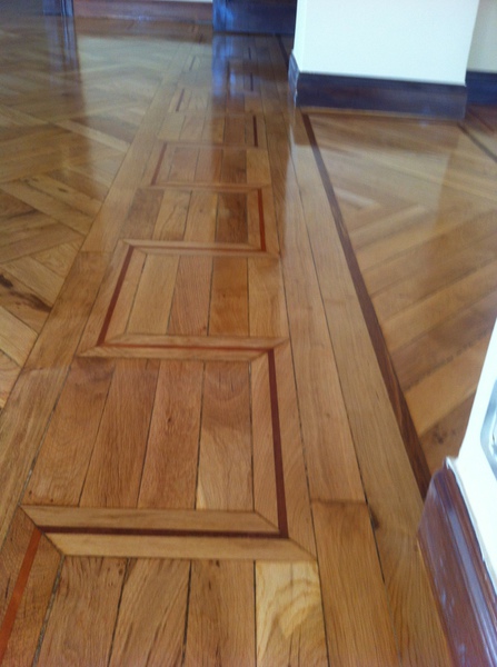 Tarima de madera noble de Roble colocada en dibujo dama, con una cenefa perimetral de roble y listón en Sapelly.